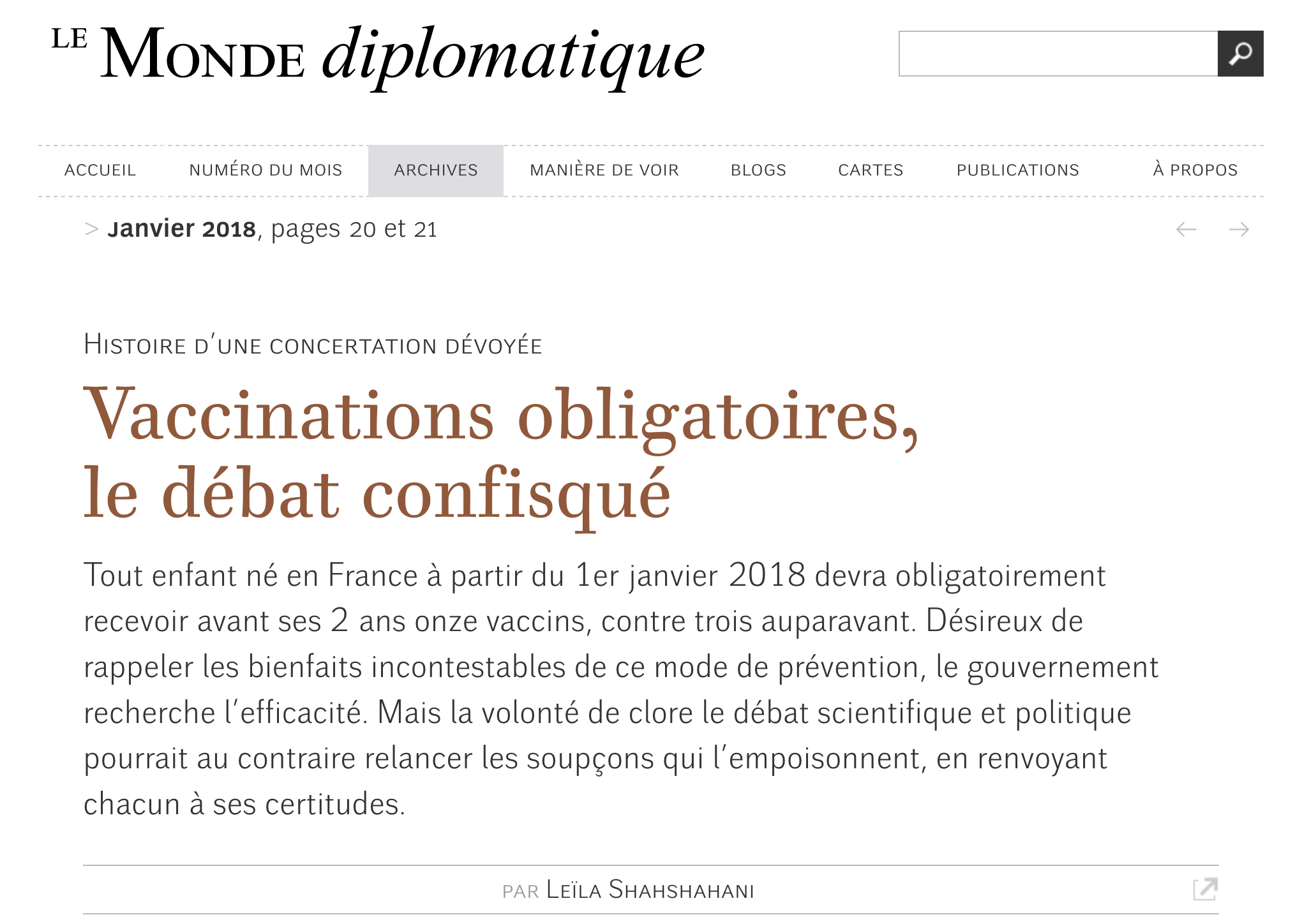 Depuis le 1er janvier 2018, tout enfant né en France doit obligatoirement recevoir avant ses deux ans onze vaccins, contre trois auparavant. En employant un discours alarmiste, qu’ils reprochent aux plus critiques de la vaccination, et en renvoyant toute réserve au camp des antivaccins, les pouvoirs publics éludent la complexité du débat. Et nagent à contre-courant d’une partie de la société décidée à prendre sa part dans les choix en matière de santé. Mon enquête sur le sujet est parue dans Le Monde Diplomatique de janvier 2018.