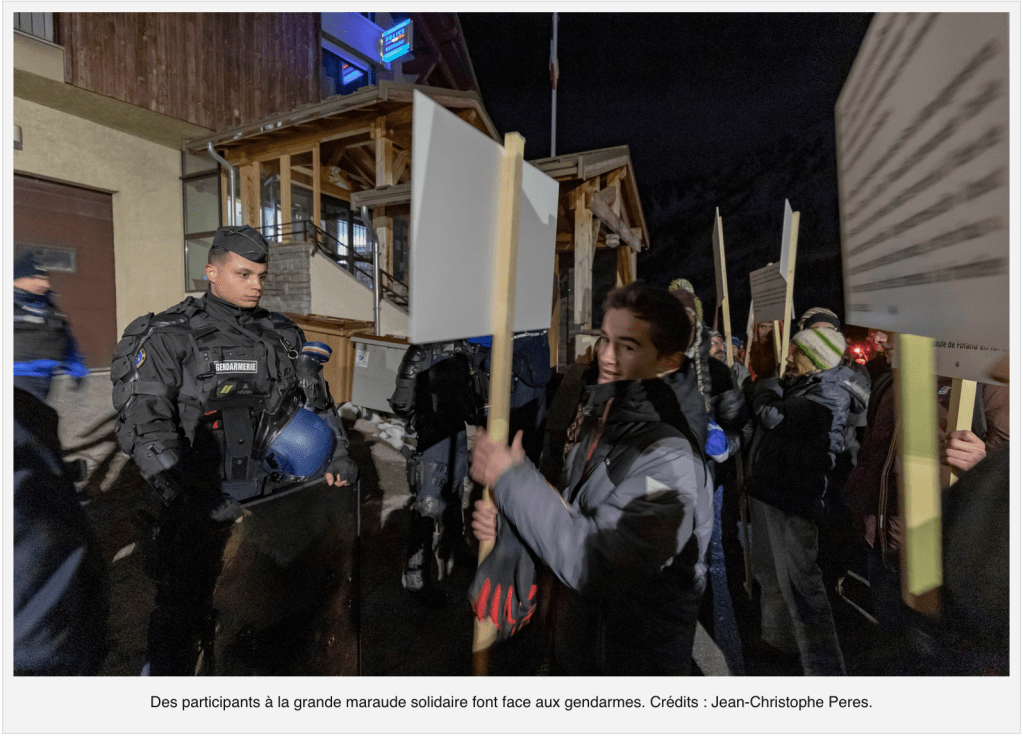 Plus tard dans la soirée, alors que le gros du rassemblement s’est dispersé, des migrants qui errent aux abords de la station sont retrouvés par des maraudeurs et conduits au Refuge solidaire de Briançon, au terme d’une partie de cache-cache avec la police. D’autres seront arrêtés. Pendant ce temps, on danse dans les boîtes de nuit de Montgenèvre ou on s’amuse à faire vrombir sa motoneige sur les pistes. Une soirée (presque) comme une autre dans cette station des Hautes-Alpes.