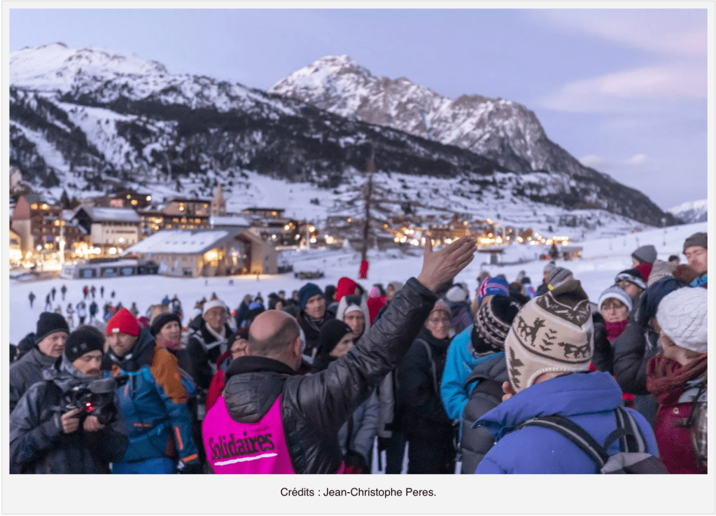 Vendredi 15 mars, des centaines de personnes ont formé une grande maraude solidaire sur les pistes de ski de Montgenèvre, dans les Hautes-Alpes. Elles manifestent leur soutien aux migrants qui traversent la frontière franco-italienne au péril de leurs vies, et à ceux qui les secourent dans la montagne.